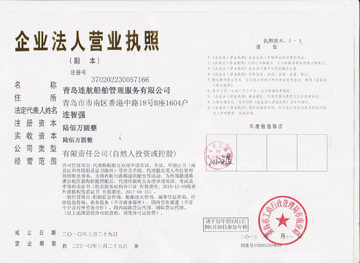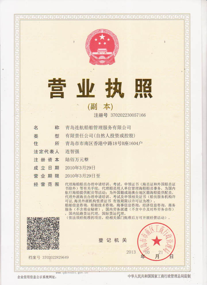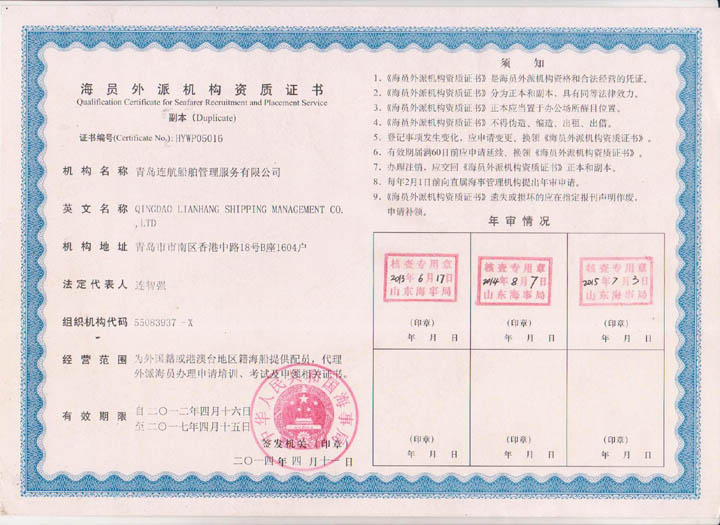 2012年04月青島連航船舶管理服務有限公司取得《海員外派機構資質證書》,為海洋船舶提供配員,代理船員用人單位管理海洋船舶船員事物,代理海洋船舶船員申請培訓、考試、申請證書等業(yè)務。