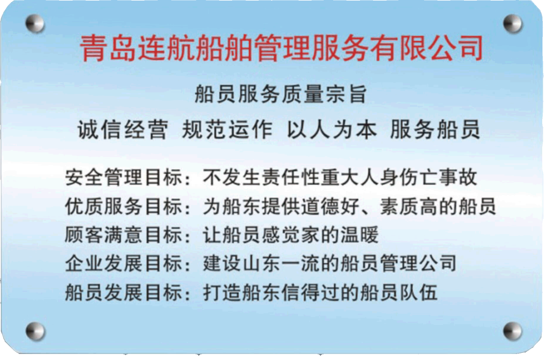 青島連航船舶管理服務有限公司(以下簡稱公司)是經中華人民共和國海事局批準認可的海員外派服務機構(海員外派資質證書編號:HYWP05016),是國家工商行政管理局注冊批準的股份制企業(yè),注冊資金600萬元。公司主要業(yè)務是代理海船船員辦理申請培訓、考試、申領證書等有關手續(xù),代理船員用人單位管理海船船員事務,為國內外航行海船提供配員與輸出等活動;同時提供信息咨詢、船舶技術咨詢、海事信息咨詢、經濟信息咨詢、商務服務、船舶物料供應、船舶維修、船舶代理貨運代理等服務業(yè)務。